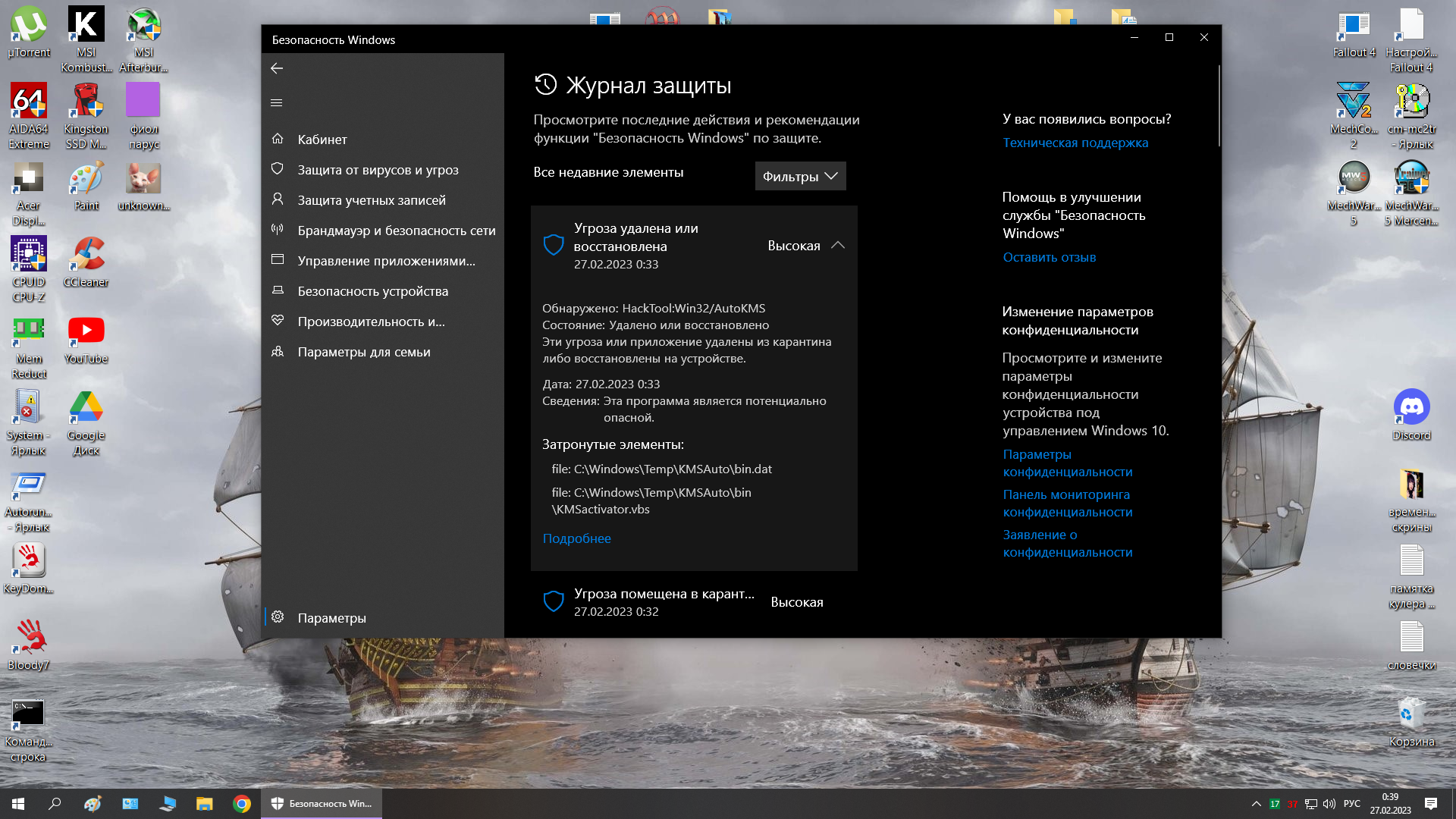 След действия. включаю мегаДефендер и провожу быструю проверку. Он находит вирус)) это кмс помещает свои щупальца в системные файлы на время своего взлома. И можно так же оставить или в исключение. Но я удаляю всегда, ни на что потом оно не влияет и антивир не заёбывает в дальнейшем. Напомню винда с 19 года стоит, как новенькая.