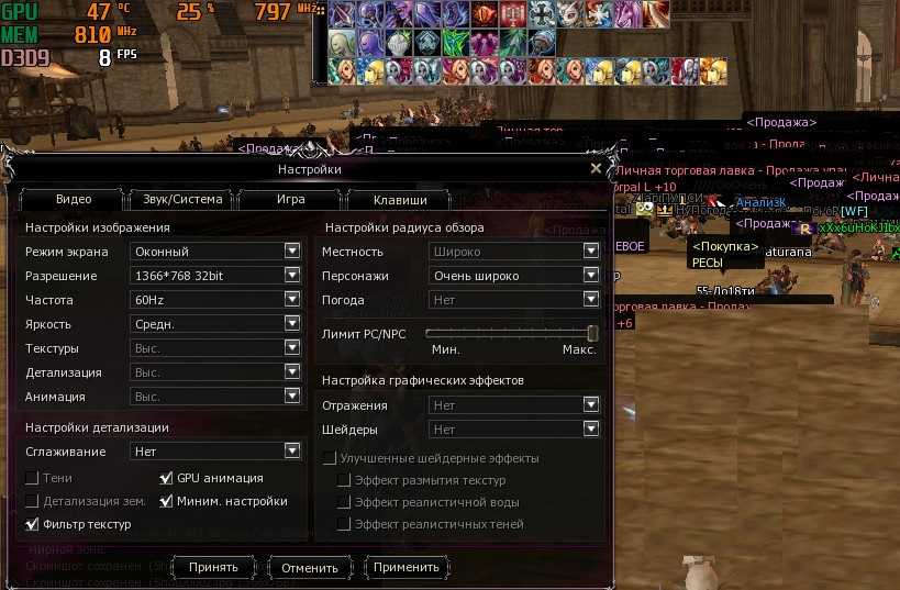 Настройки в ла2- радиус обзора местность и пресонажи - "стандартно" лимит нпц ползунок на половине. Тексуры высокое. Все остальное низкое. Галочка стоит только на "фильтр текстур". Режим экрана - оконный( без рамки)