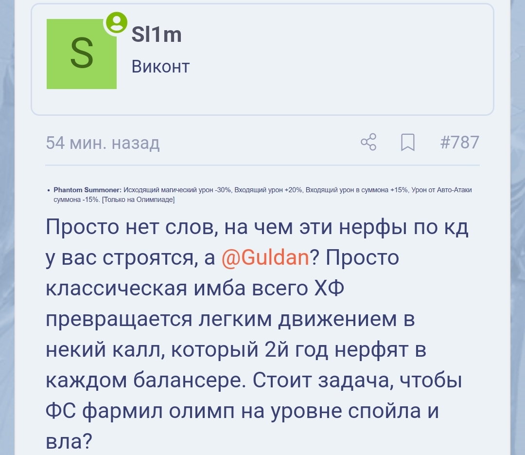 Просто нет слов, на чем эти нерфы по кд у вас строятся, а @Guldan? Просто классическая имба всего ХФ превращается легким движением в некий калл, который 2й год нерфят в каждом балансере. Стоит задача, чтобы ФС фармил олимп на уровне спойла и вла?