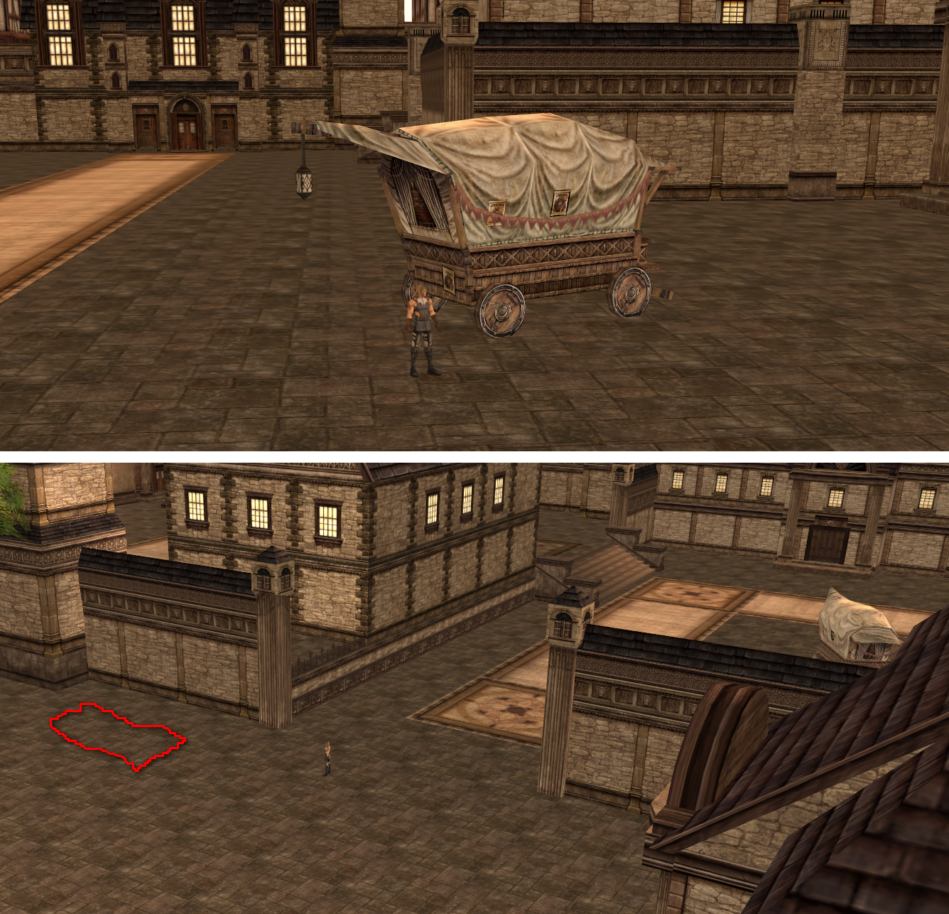 Скинь скрин карты вид сверху этой карты. Карта несмотря на всё, большеватая, и много открытых зон. так из таких скринов сложно подумать над преградами. Емпатик прав на счёт ящиков. (эт самое лорное, адекватное препятствие) Не нужно городить кучу, но и усложнять ими. То что повозка стоит в центре, тебе не кажется что это чуть чуть нелепо?) на то место, какую ни будь статую небольшую, а повозка не вплотную к стенке